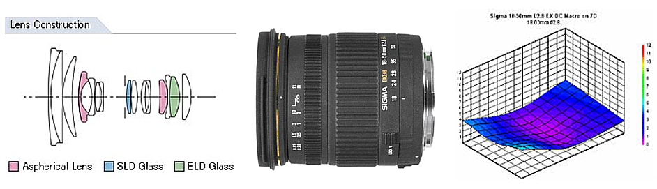 Další vlastnosti Objektiv SIGMA 18-50/2.8 EX DC MACRO speciálně konstruovaný pro digitální SLR s exklusivní povrchovou úpravou (označení EX). Konstrukce objektivu obsahuje několik skel SLD(skla s nízkým rozptylem) a také obsahuje sklo ELD ( sklo s extra nízkým rozptylem). Vnitřní ostření eliminuje rotaci předního členu a umožňuje snadněji použít cirkulární polarizační filtr i veškeré efektové filtry. Sluneční clona je součásti dodávky.