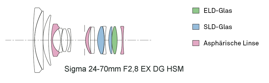 Objektiv Sigma 24-70mm f/2.8 EX DG HSM poskytuje dobrou světelnost f/2.8 v celém rozsahu, ultrazvukové HSM ostření autofokusu a ELD SLD čočky.V jeho konstrukci jsou přidány ELD, SLD a asférické optické členy, které mají odstranit všechny barevné aberace (vady).