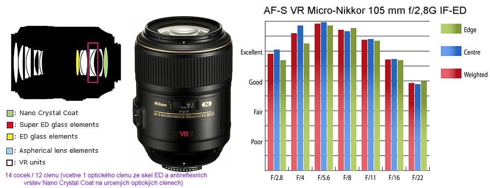 Nikon 105mm f/2.8G AF-S VR Micro NIKKOR je jednička mezi makroobjektivy. Je vybaven ultrazvukovým zaostřováním SWM a stabilizací obrazu Nikon VRII, s kterou můžete prodloužit expoziční čas při fotografování z ruky až o 4 expoziční stupně proti standardu. Nicméně tyto vlastnosti spíše využijete při fotografování portrétů, kde objektiv dosahuje rovněž skvělých výsledků. Antireflexivní vrstvy z nanokrystalů účinně redukují nežádoucí reflexy a závoje. Objektiv je hrdým nositelem mnohých ocenění. Za všechny uveďme ocenění asociace TIPA za rok 2006 v kategorii profesionálních objektivů.
