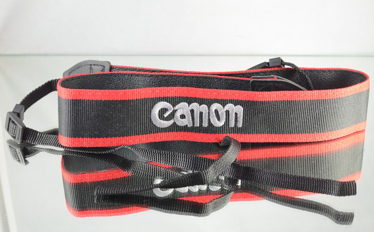 Ramenní popruh pro fotoaparáty Canon černo-červený se stříbrným vyšívaným nápisem.