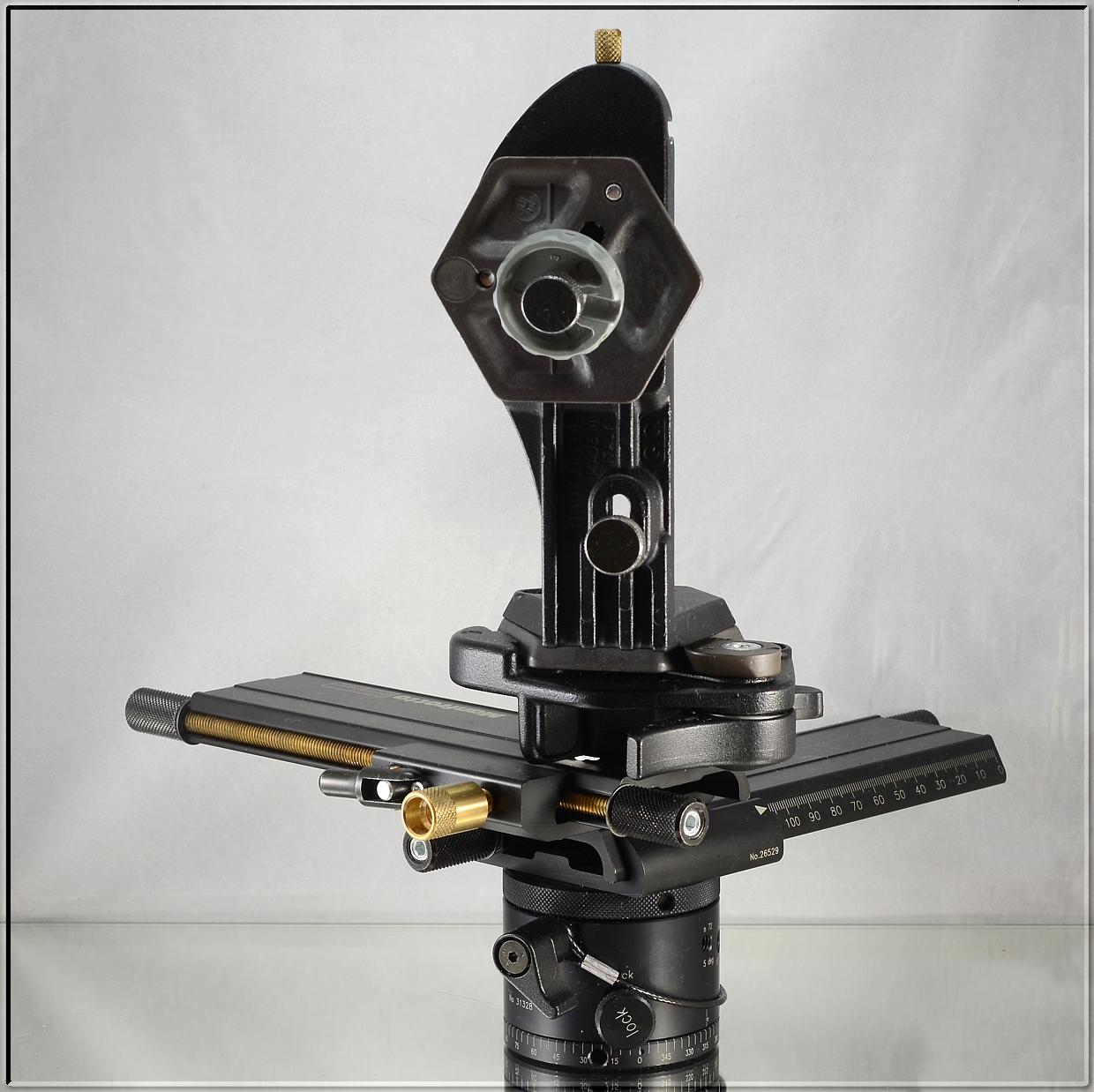 Druhý posuvník, který je výše a je kolmo posazený na posuvníku prvním, slouží pro ustavení osy objektivu s osou otáčení. Pokud fotografujeme s fotoaparátem orientovaným horizontálně a závit na stativu fotoaparátu odpovídá podélné ose objektivu, potom není potřeba tento druhý posuvník použít.