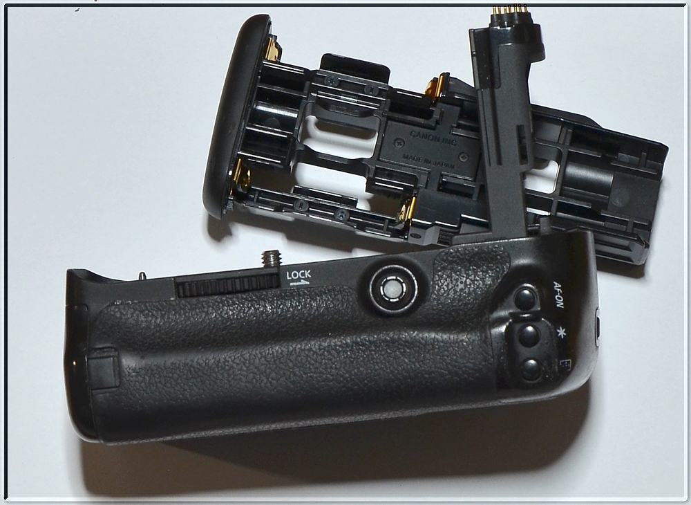 Součástí aukce je: grip Canon BG-E11, Držák pro akumulátor LP-E6, Držák na 6 AA baterií .