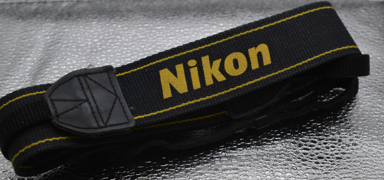 Ramenní popruh pro fotoaparát vyrobený z tkaniny a obsahující logo společnosti Nikon
