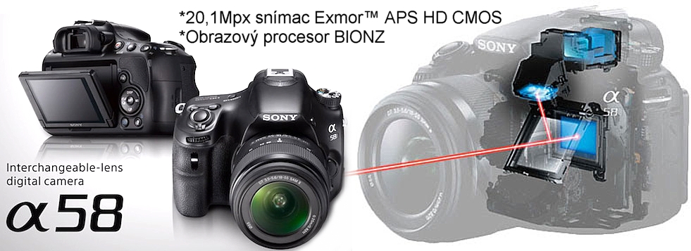 Sony SLT-A58 je fotoaparát s výměnnými objektivy a technologií Translucent Mirror s rozlišením 20MPix. Je vybaven procesorem BIONZ s dvojitou redukcí šumu. Umožňuje i natáčení videosekvencí ve FullHD a nabízí i řadu kreativních filtrů a stylů. Je kompatibilní s objektivy s bajonetem Sony Alpha. Má OLED hledáček s rozlišením 800x600 bodů.