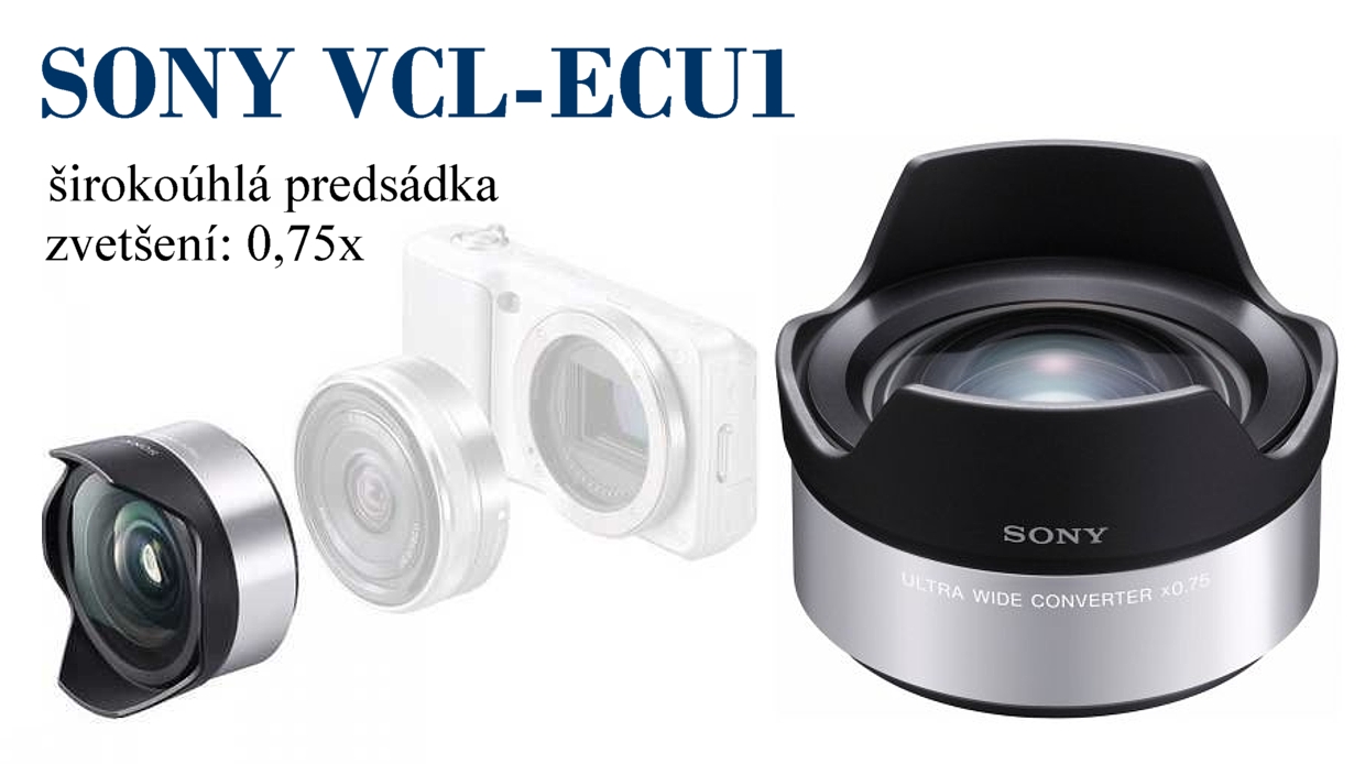 Širokoúhlá předsádka Sony VLC-ECU1 s 0,75x násobkem ohniskové vzdálenosti objektivu. Předsádka je určena pro fotoaparáty Sony řady NEX.