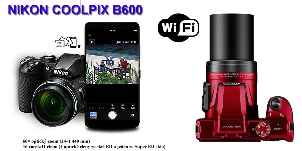 Nikon CoolPix B600 *Ultrazoom*CMOS 16,76Mpx*60× optický zoom 24-1 440 mm*Full HD Video(1 080/60i/30p)*WIFI*Bluetooth*