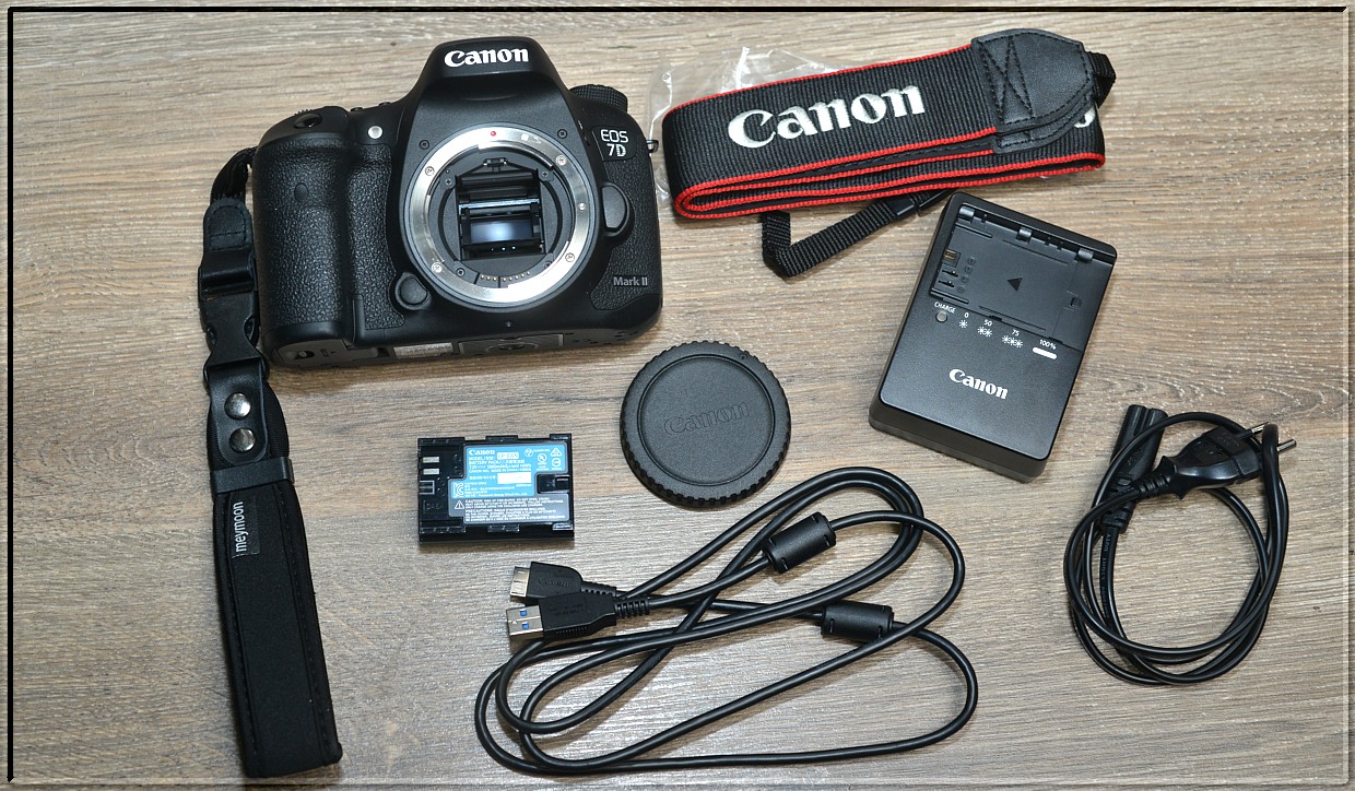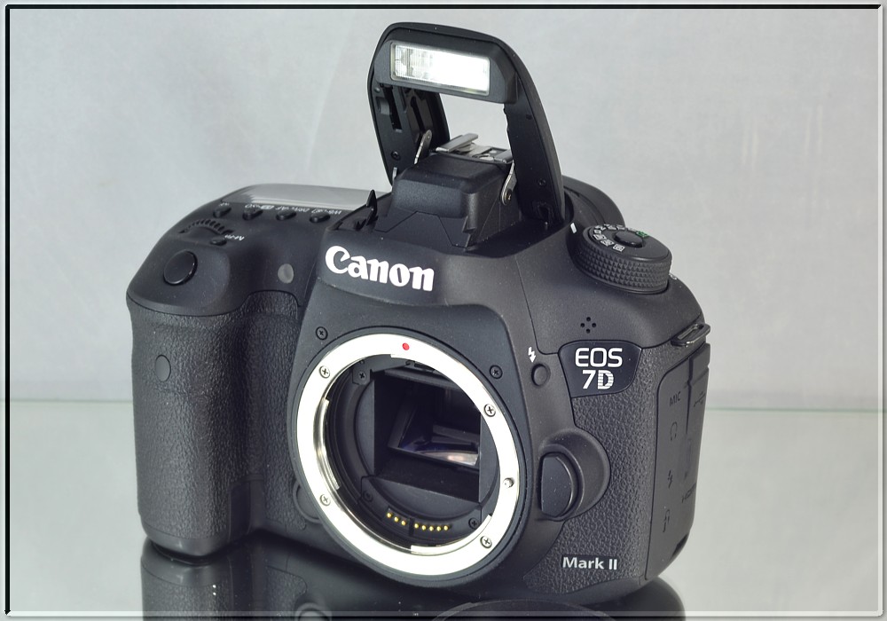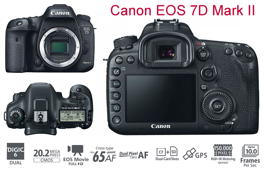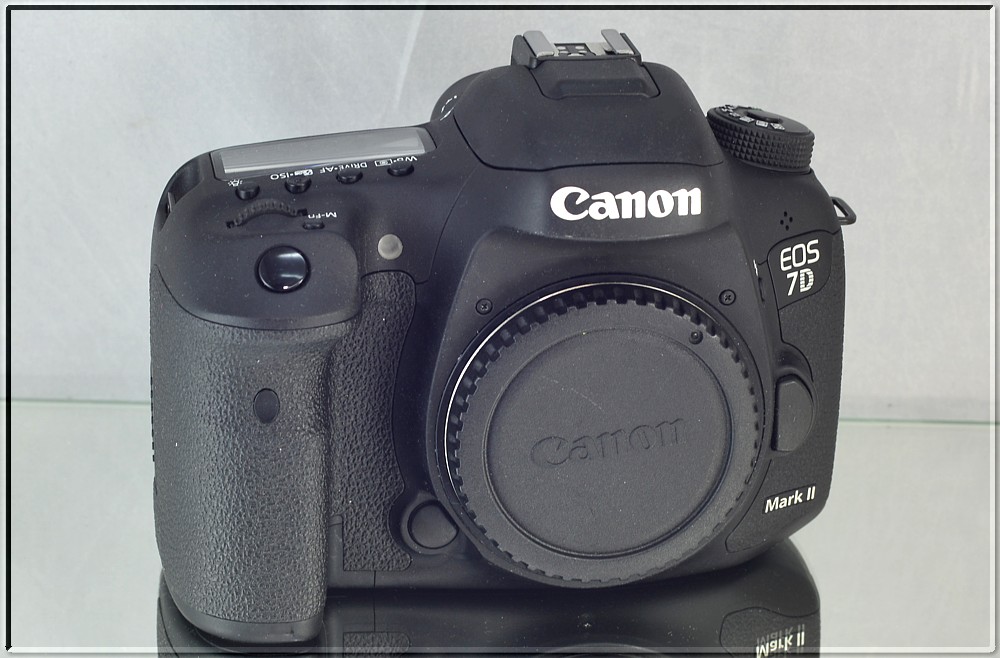 Canon EOS 7D Mark II je nástupcem modelu EOS 7D. Je vybaven CMOS snímačem s rozlišením 20,2 MPix. Má odolné tělo z hořčíkových slitin a odolá vlhkosti a prachu. Natáčí FullHD video. Má vestavěnou GPS a USB 3. Má 2 sloty pro paměťové karty.