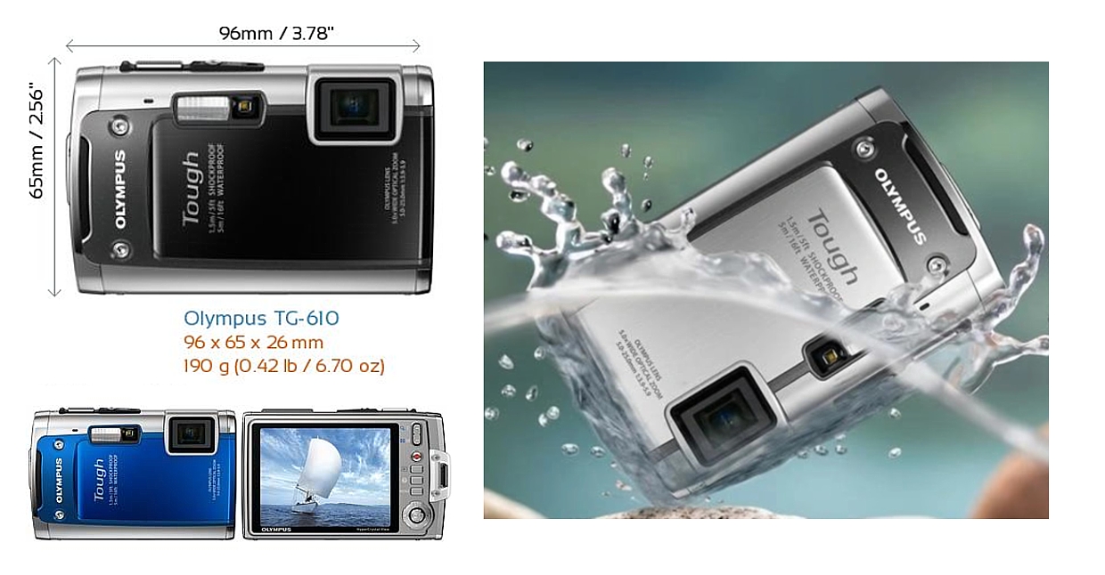 Vodotěsný do 5m, nárazuvzdorný z 1.5m a mrazuvzdorný do -10°C, to je Olympus TG-610. Kromě skvělé odolnosti nabízí ještě řadu funkcí, které poskytují vynikající kvalitu obrazu, použitelnost a funkčnost v jakékoliv situaci. Můžete snímat 14-ti megapixelové snímky, třeba v režimu 3D fotografie. Své snímky můžete sdílet díky Eye-Fi kartám a automaticky nahrátvat bezdrátově na vaše oblíbené webové stránky nebo PC.