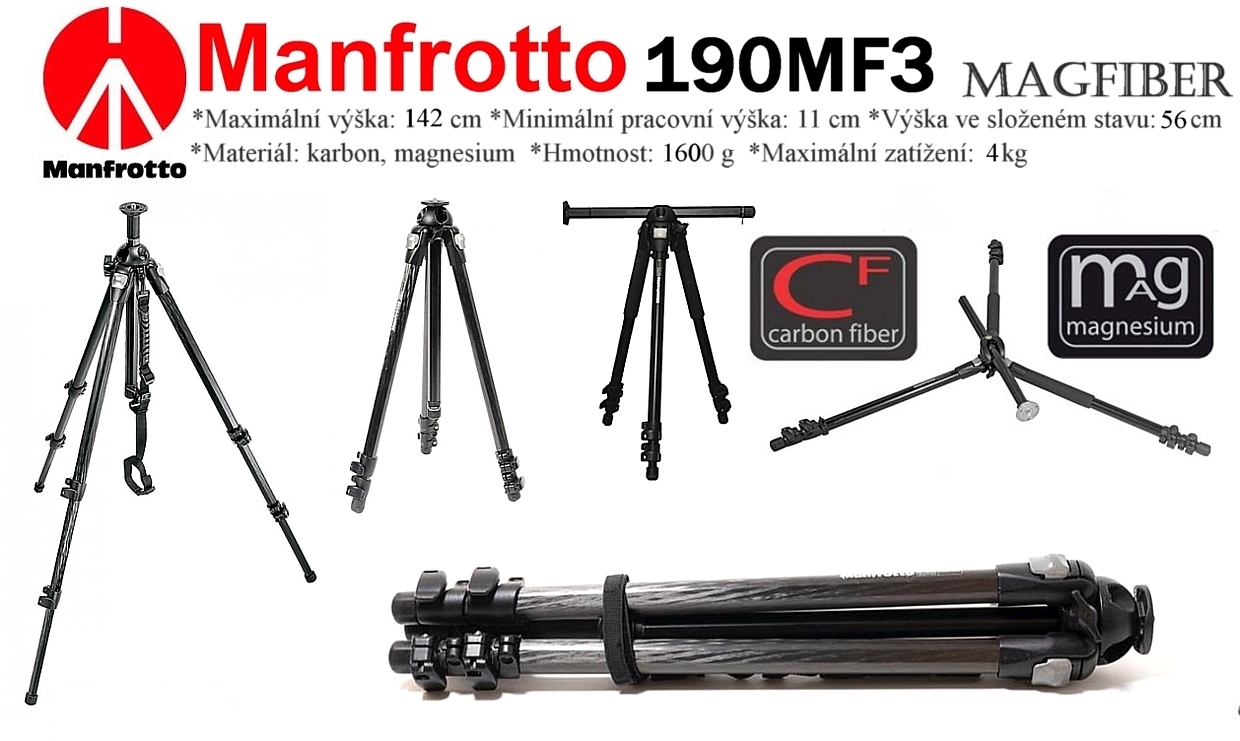 Manfrotto 190MF3 MAGFIBER *Carbon*Profesionál Stativ*pracovní výška: 11 cm - 142 cm*hmotnost 1.6 kg*nosnost: 4kg*