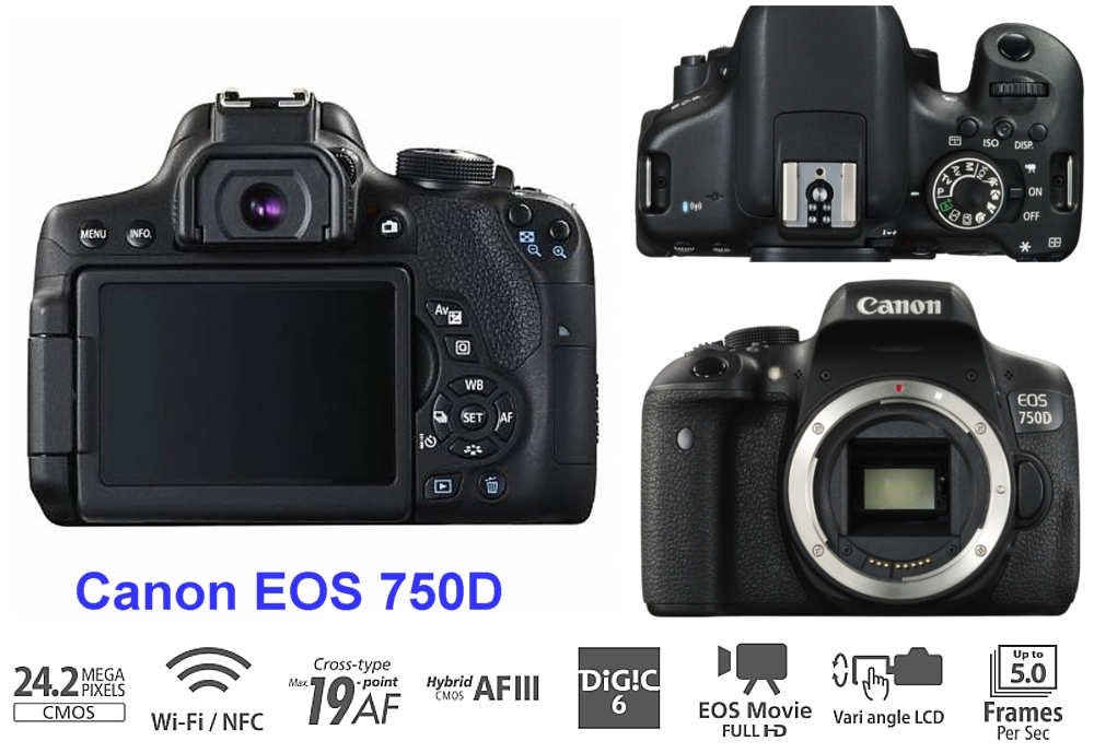 Canon EOS 750D je digitální zrcadlovka střední třídy vhodná jak pro fotografování, tak pro natáčení videa. Má 24MPix CMOS snímač, výklopný dotykový displej s velkým rozlišením, hybridní autofokus, vstup pro externí mikrofon, natáčí Full HD video, má funkci wi-fi včetně NFC a mnoho dalšího.