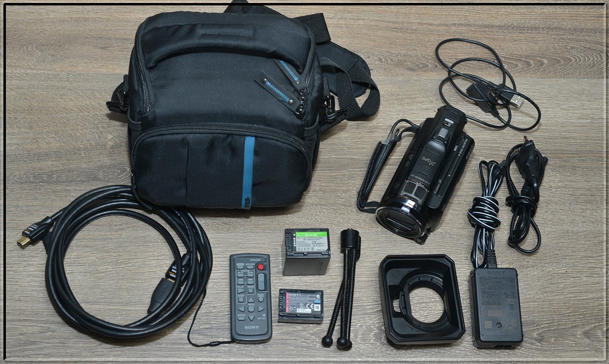 Součástí aukce: Camcorder, 2x aku, nabíječka, USB, HDMI, dálkové ovládání, fotobrašna... (1. fotka)