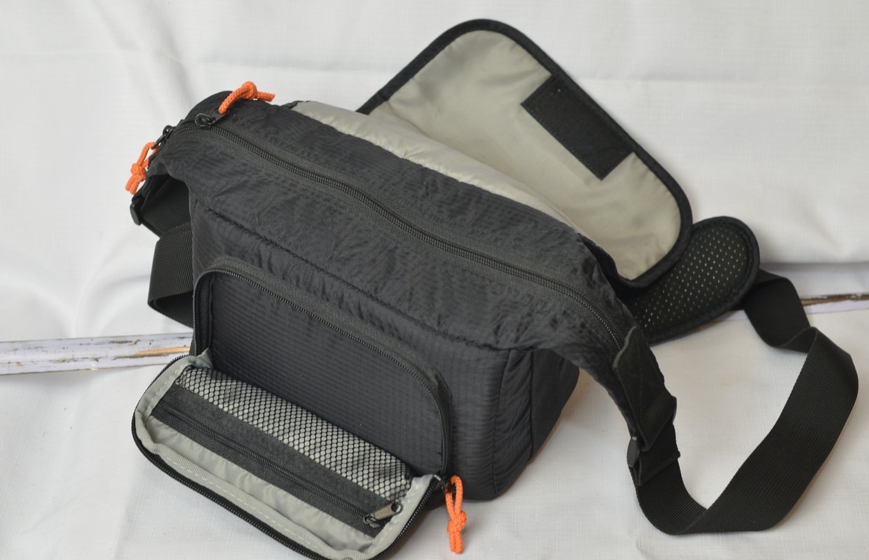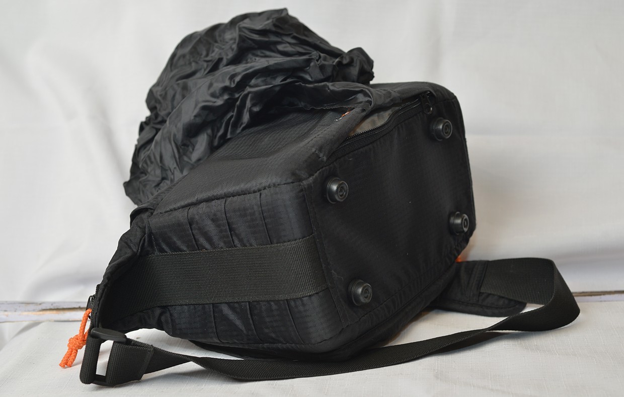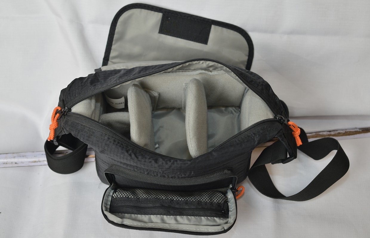 Víko se doširoka otevírá. Brašnu lze velkoryse otevřít shora pomocí zipu a klopa víka je zajištěna suchým zipem. Vnější kapsa na přední straně může sloužit jako další úložný prostor. Tato kapsa obsahuje malou vnitřní síťovanou kapsu pro ještě větší organizaci. Přiložená pláštěnka je uložena v kapse na zadní straně, kterou lze otevřít zespodu pomocí suchého zipu. Je pevně připevněna k brašně, a proto se nedá ztratit. Všitá gumička zajišťuje, že pláštěnka bezpečně sedí kolem brašny.