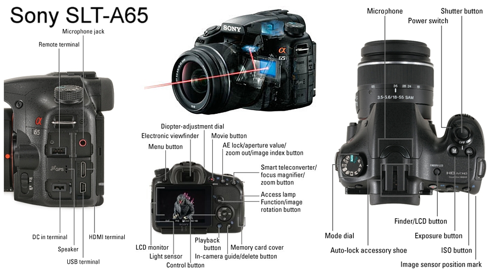 Sony SLT-A65 je fotoaparát s výměnnými objektivy, který využívá technologii polopropustného zrcátka. To umožňuje rychle ostřit nejen při focení, ale i při režimu živého náhledu a natáčení videa. Má elektronický hledáček (ne optický), CMOS snímač s rozlišeníM 24MPix, rychlé snímání 10 snímků za sekundu, natáčí Full HD video, má české menu. Hledáček má rozlišení 2 359 296 bodů.