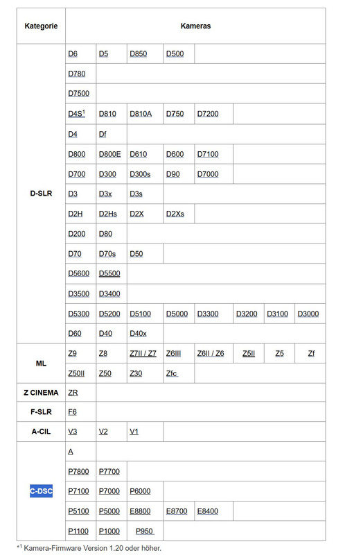 : FX-format/DX-format Nikony DSLR (Digitální zrcadlovky), MSLR (Digitální bezzrcadlovky) a Nikon Coolpix (C-DSC) s podporou systému kreativního osvětlení Nikon (CLS).