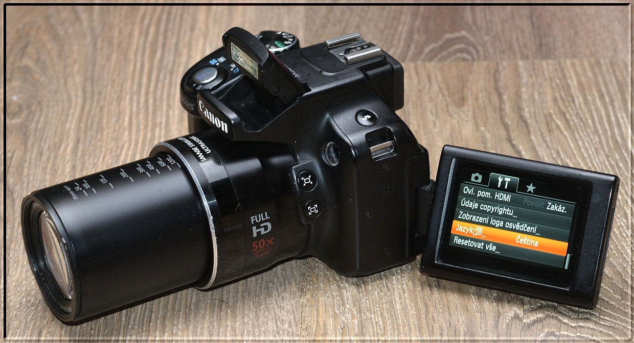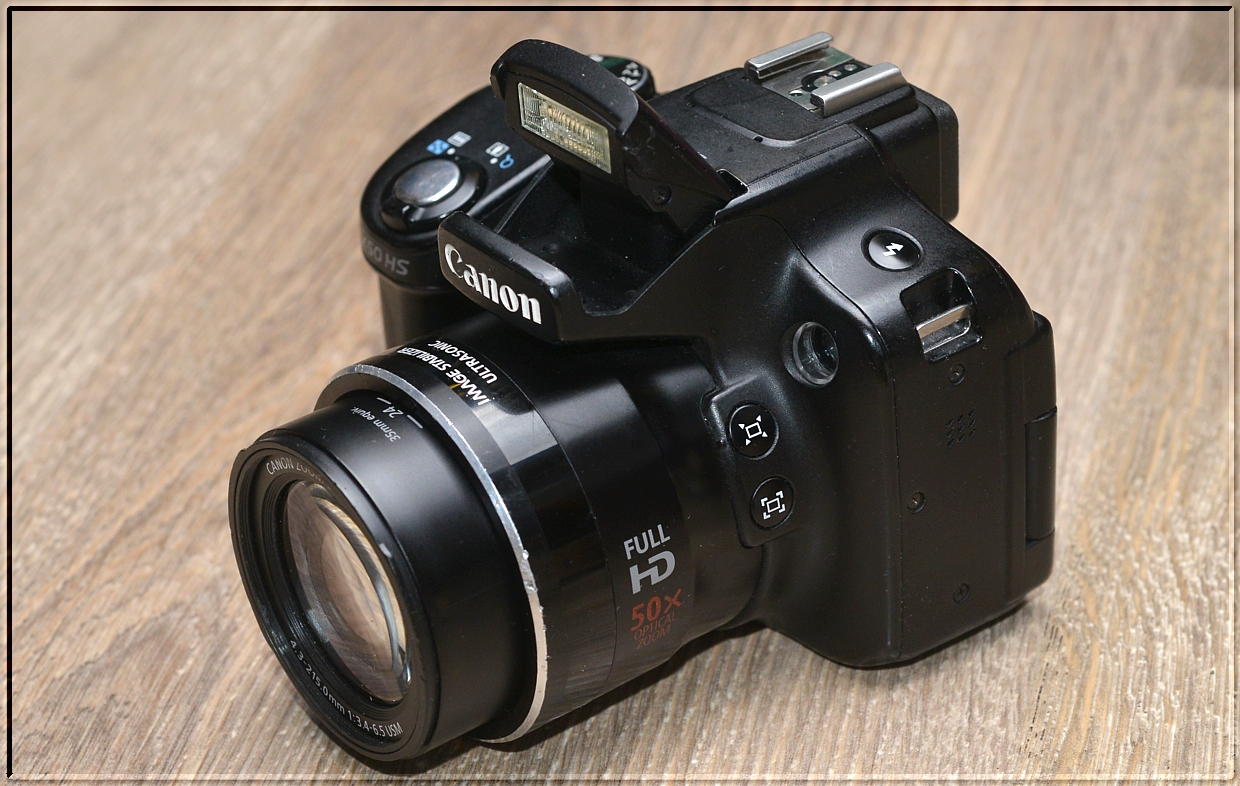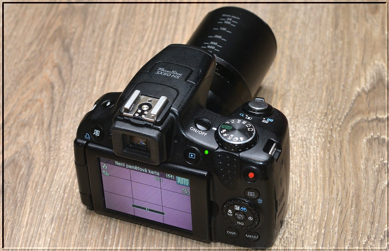 Canon PowerShot SX50 HS je výkonný 50× ultrazoom s rozsahem 24 – 1200mm. Dále disponuje CMOS snímačem s 12,1 Mpix, Full HD videosekvencí, možností ručního nastavení a ukládání snímků v JPEG i RAW. Výklopný dispelj je veliký 2,8", ale pozorovat je též možno prostřednictvím elektronického hledáčku.