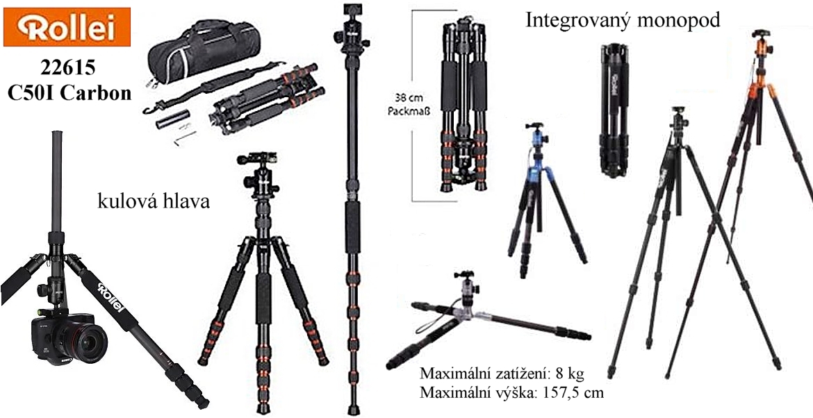 Rollei C50i s kulovou hlavou *karbonový stativ s funkcí tripodu i monopodu*nosnost 8Kg*Maximální výška: 157,5 cm*