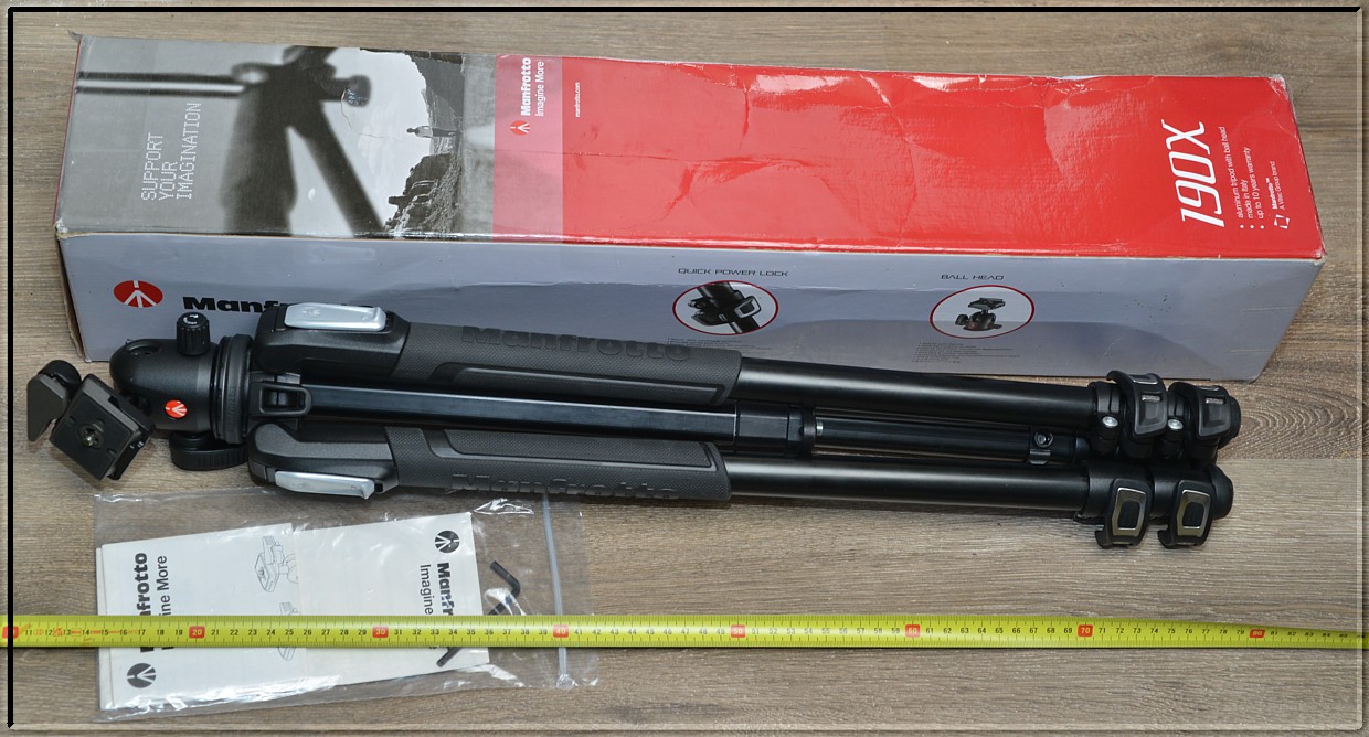 Součástí aukce je: Stativ, kulová hlava, rychloupínací destička... Vše v originál krabici (1. fotka)