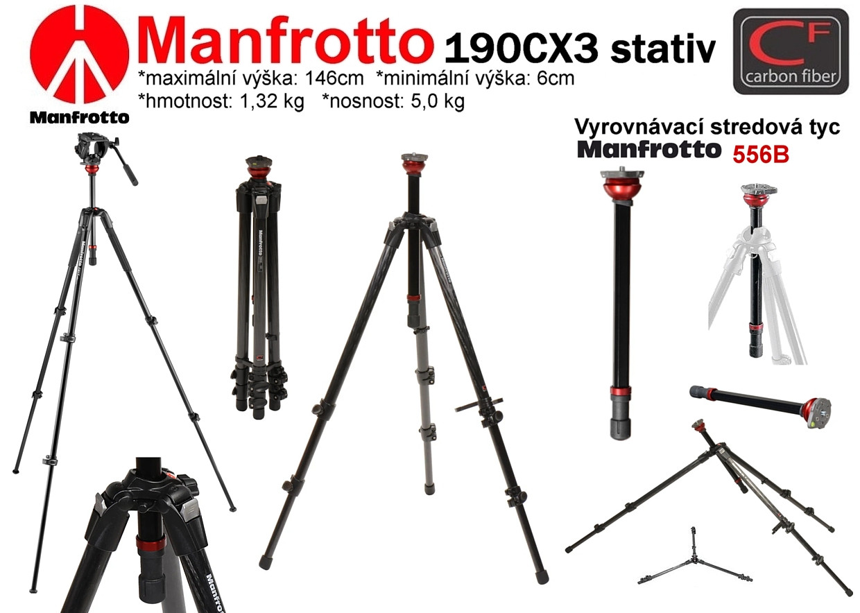 MANFROTTO 190CX3 + 556 B *Karbonový Stativ + Vyrovnávací středová tyč*hmotnost: 1,32 kg*Nosnost: 5 kg*