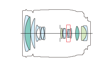 Popis konstrukce objektivu: 16 čoček ve 12 skupinách, včetně UD členu a asférických čoček