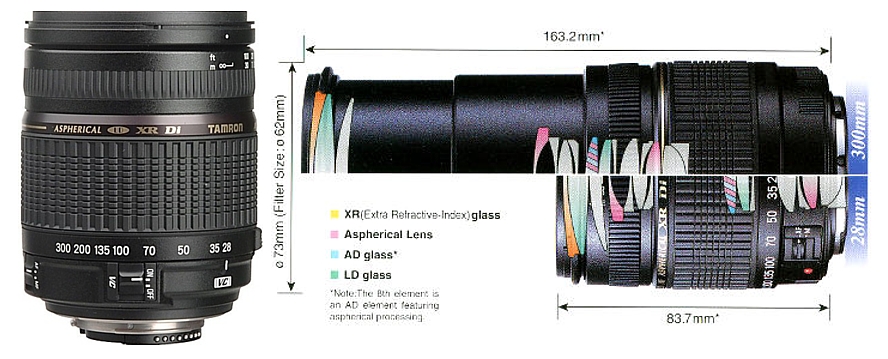 Při použití AF28-300mm F/3.5-6.3 XR Di VC objektivu se zrcadlovkou s velkým obrazovým snímačem nabízí obrovský rozsah ohniskových vzdáleností od 28mm až do 300mm. Při použití s digitální zrcadlovkou s malým APS-C snímačem, objektiv nabízí rozsah 43mm až 465mm ekvivalentně* (zorný úhel 5°20').Tamron AF 28-300mm F/3,5-6,3 XR Di VC LD Macro je vysokovýkonný telezoomový objektiv, který vyniká především velkým rozsahem ohniskové vzdálenosti. Je velmi univerzální.
