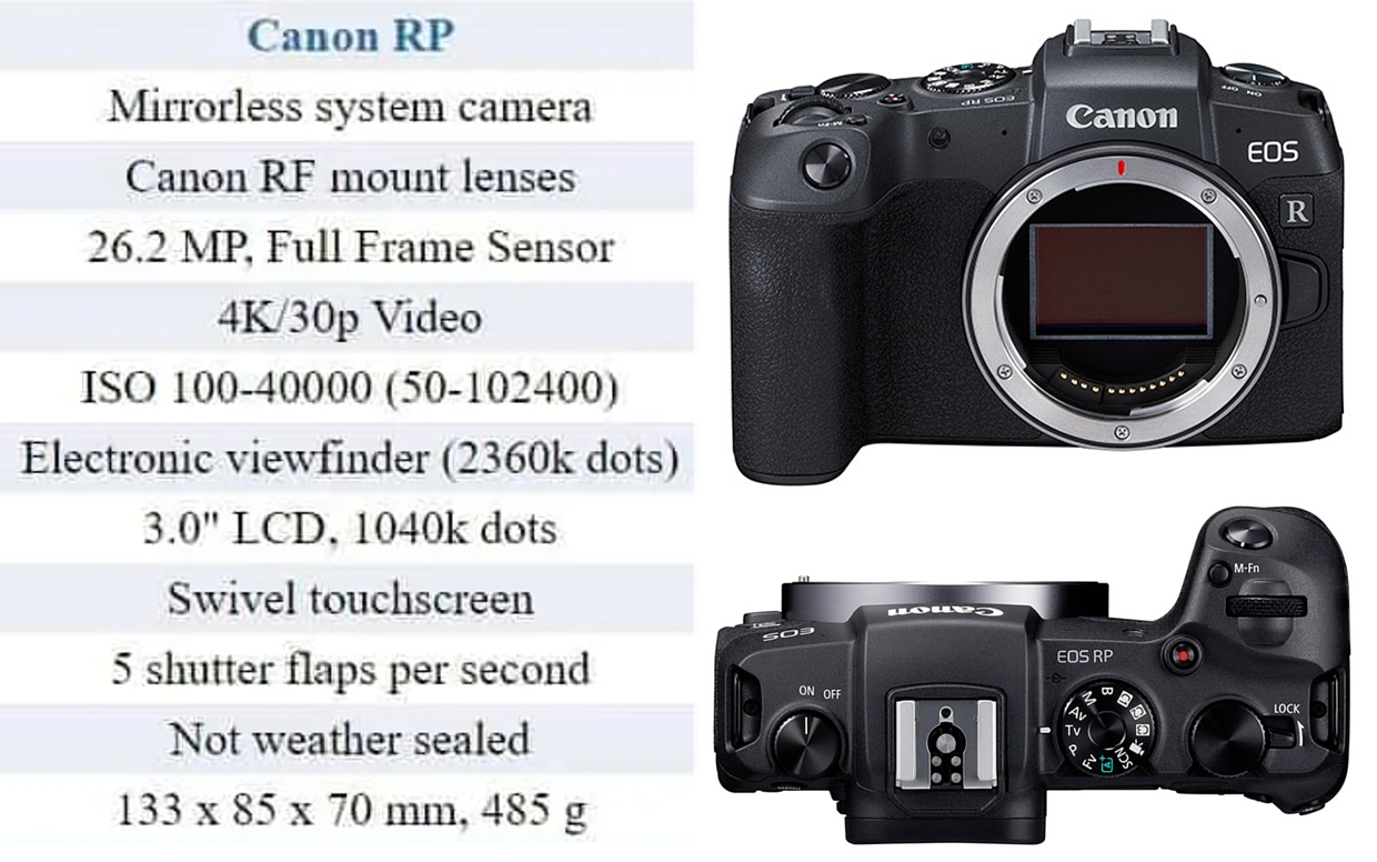 Nový EOS RP cenově dostupný fotoaparát s rozlišením 26,2 mpx z produktové řady full-frame modelů značky Canon. EOS RP je postaven na inovativním bajonetu RF s průměrem 54 mm, s 12pinovým vysokorychlostním komunikačním systémem – spolu s optickým výkonem obvyklým u full-frame přístrojů nabízí veškerý potenciál k maximálnímu využití chystaných objektivů RF, Fotografové i kameramani mohou navíc využít veškerý výkon svých stávajících objektivů EF a EF-S, a to díky trojici dostupných adaptérů EF-EOS R včetně varianty s ovládacím kroužkem a s podporou zásuvných filtrů. Můžete ho ovládat chytrým telefonem přes Wifi, je vybaven funkcemi nahrávání videa ve 4k 25p a full HD 60p, časosběrným videem, rychlost sériového snímání: 5 sn./s. Lze pořídit i ve zvýhodněném setu s objektivem Canon RF 24-105mm f/4-7,1 IS STM.