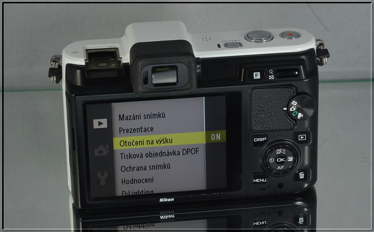 Všechna ostatní nastavení (vyvážení bílé, citlivost, expoziční režim, ...) se provádí v menu. Popravdě musím říci, že to mi zezačátku trochu vadilo, protože jsem zvyklý na ovládání zrcadlovky, kde má každá důležitá funkce své tlačítko. Ale po velmi krátké době jsem si na to zvyknul, protože nastavení jednotlivých funkcí je i tak velice rychlé. Všechna nastavení jsou totiž přístupná hned v první úrovni menu a pohyb mezi jednotlivými položkami se provádí otočným voličem. Je to tedy dost podobné ovládání levnějších zrcadlovek, u kterých se k těmto funkcím dostaneme přes tlačítko Info.