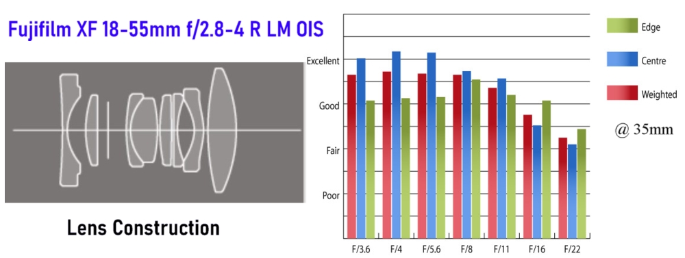 Fujifilm XF18-55mm f/2.8-4 se světelností F2.8 - 4.0, proměnlivou ohniskovou vzdáleností 18-55mm. Konstrukci tvoří 14 členů v 10 skupinách, a to včetně 3 asférických členů a 1 členu s extra nízkým rozptylem.