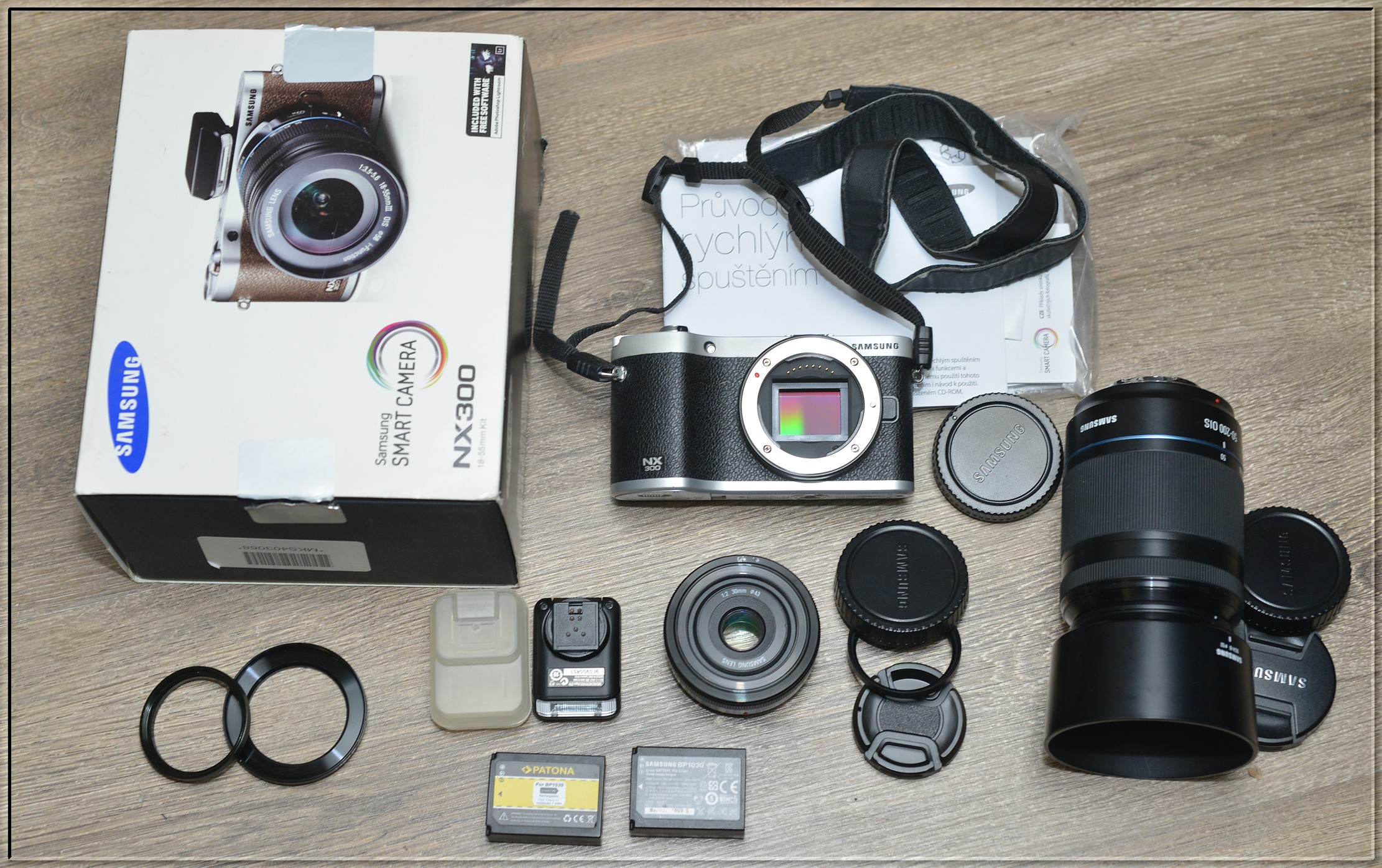 Součástí aukce je: kamera, objektiv 30 mm F2,0, UV filtr, objektiv 50–200 mm F/4–5,6 OIS, nabíječka, 2x baterie, blesk... Vše v originál krabici. (1. fotka)
